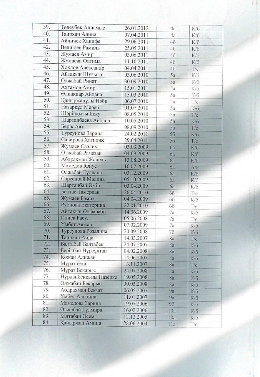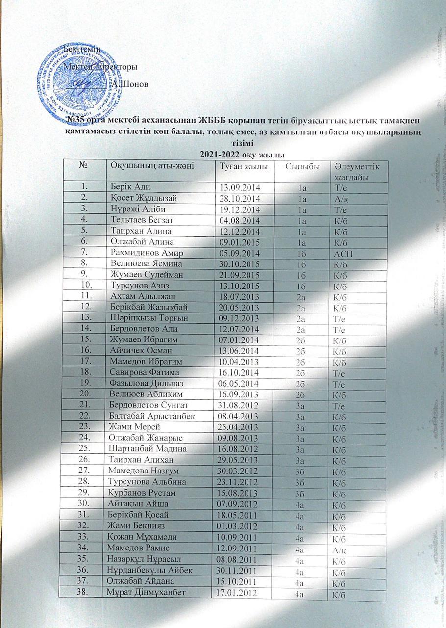 №35 орта мектебі асханасынан ЖБББ қорынан тегін біруақыттық ыстық тамақпен қамтамасыз етілетін көп балалы, толық емес, аз қамтылған отбасы оқушыларының тізімі