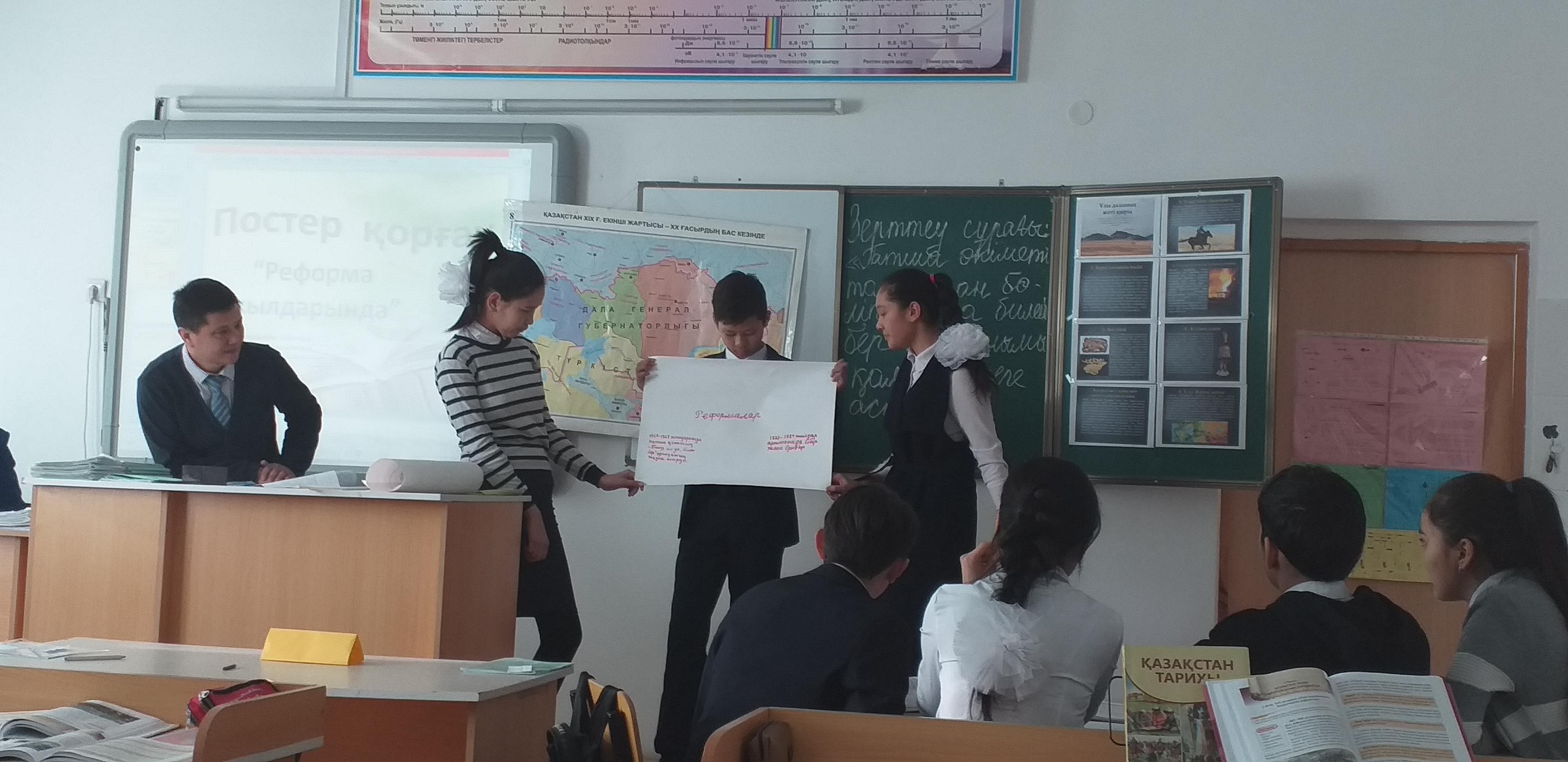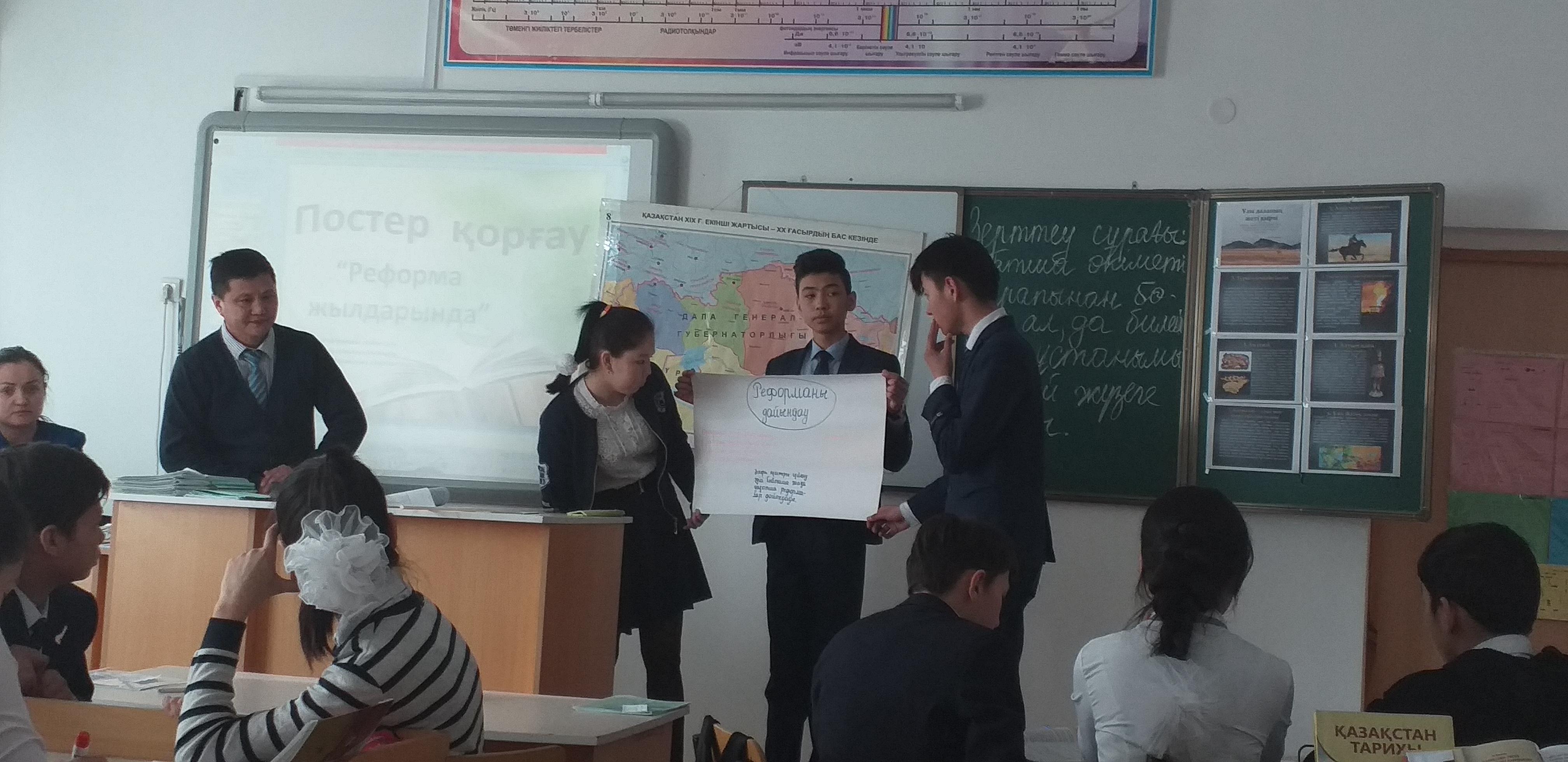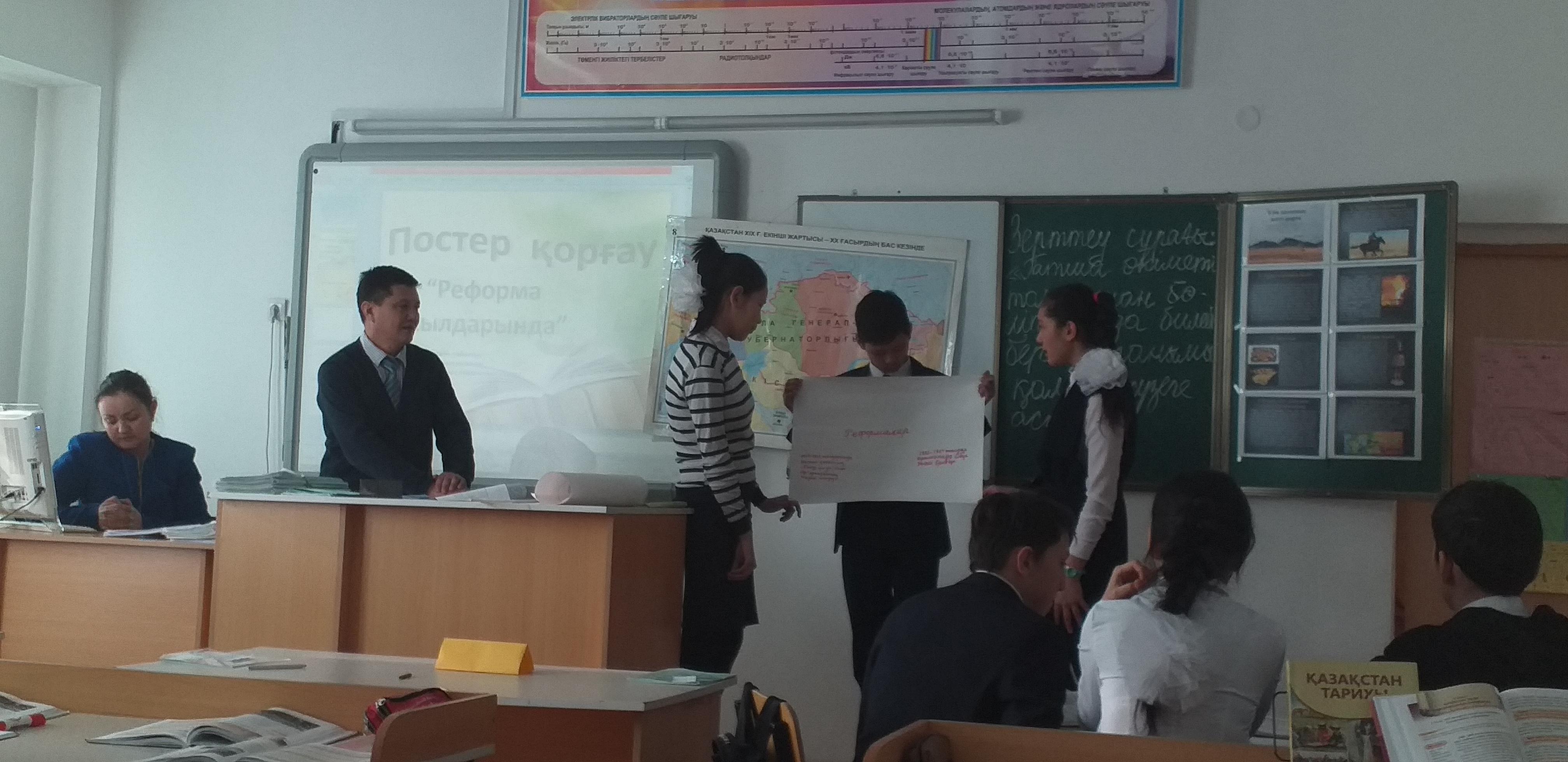 3.С.З. Дюсембаев. Тарих пәнінен 8 а сыныбында «ХІХ ғасырдың екінші жартысындағы реформалар» тақырыбында ашық сабақ көрсетті. Мұғалім сабаққа жақсы дайындалған. Көрнекілік құралдары мол. Оқушылар сабаққа түгел, белсене қатысып отырды. Өзін-өзі бағалау парақшаларын, үлестірмелі карточкалар, суреттерді қолданды. Әр тапсырмадан соң қалыптастырушы бағалау үдерісі жүріп отырды. Жаңартылған бағдарлама бойынша әртүрлі әдіс – тәсілдерді тиімді пайдаланды. Мұғалім сабақты үлкен шеберлікпен өтті. Оқушылардың қызығушылығын арттыратын әртүрлі ойындарда болды.