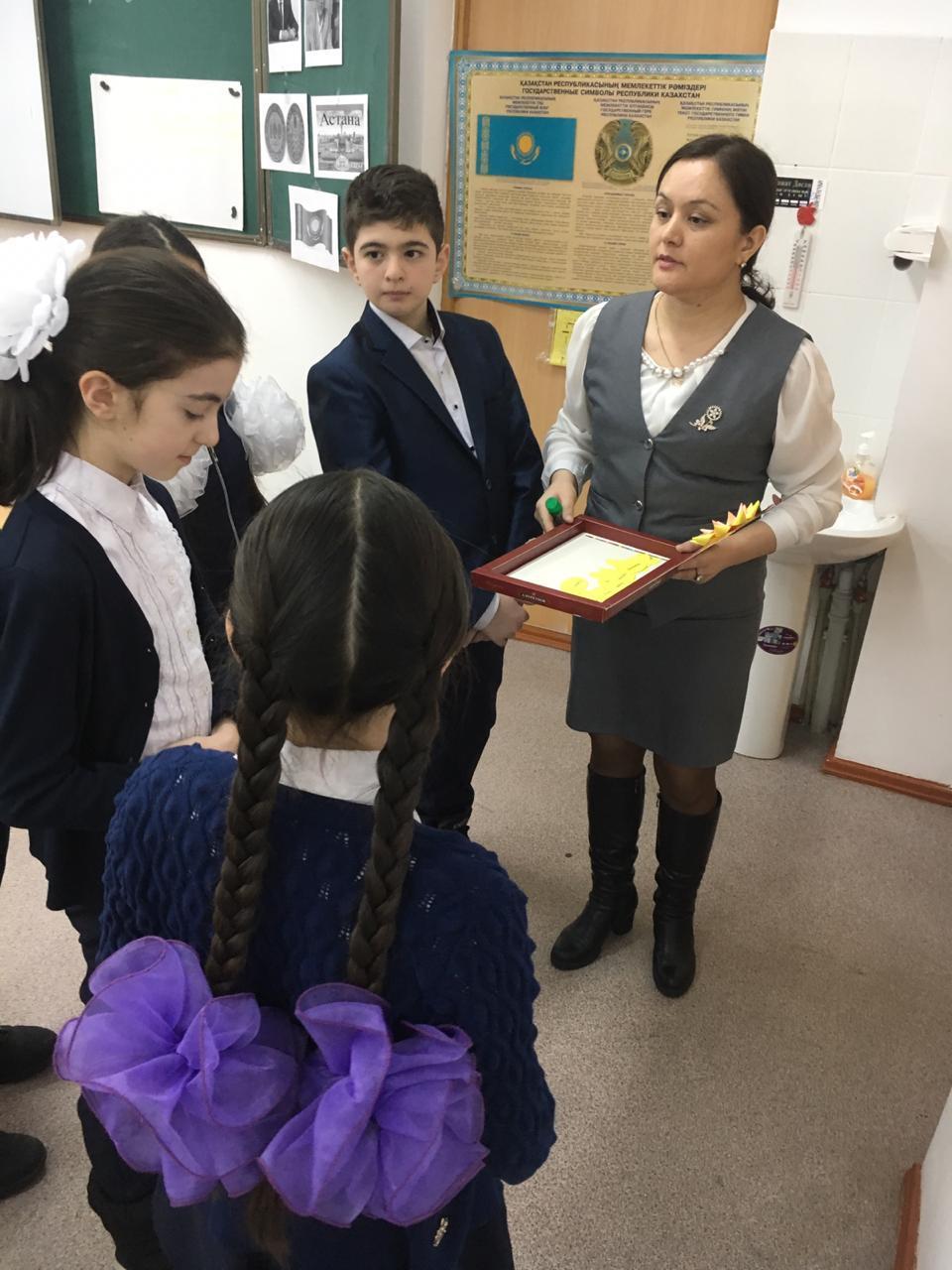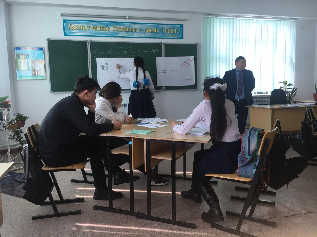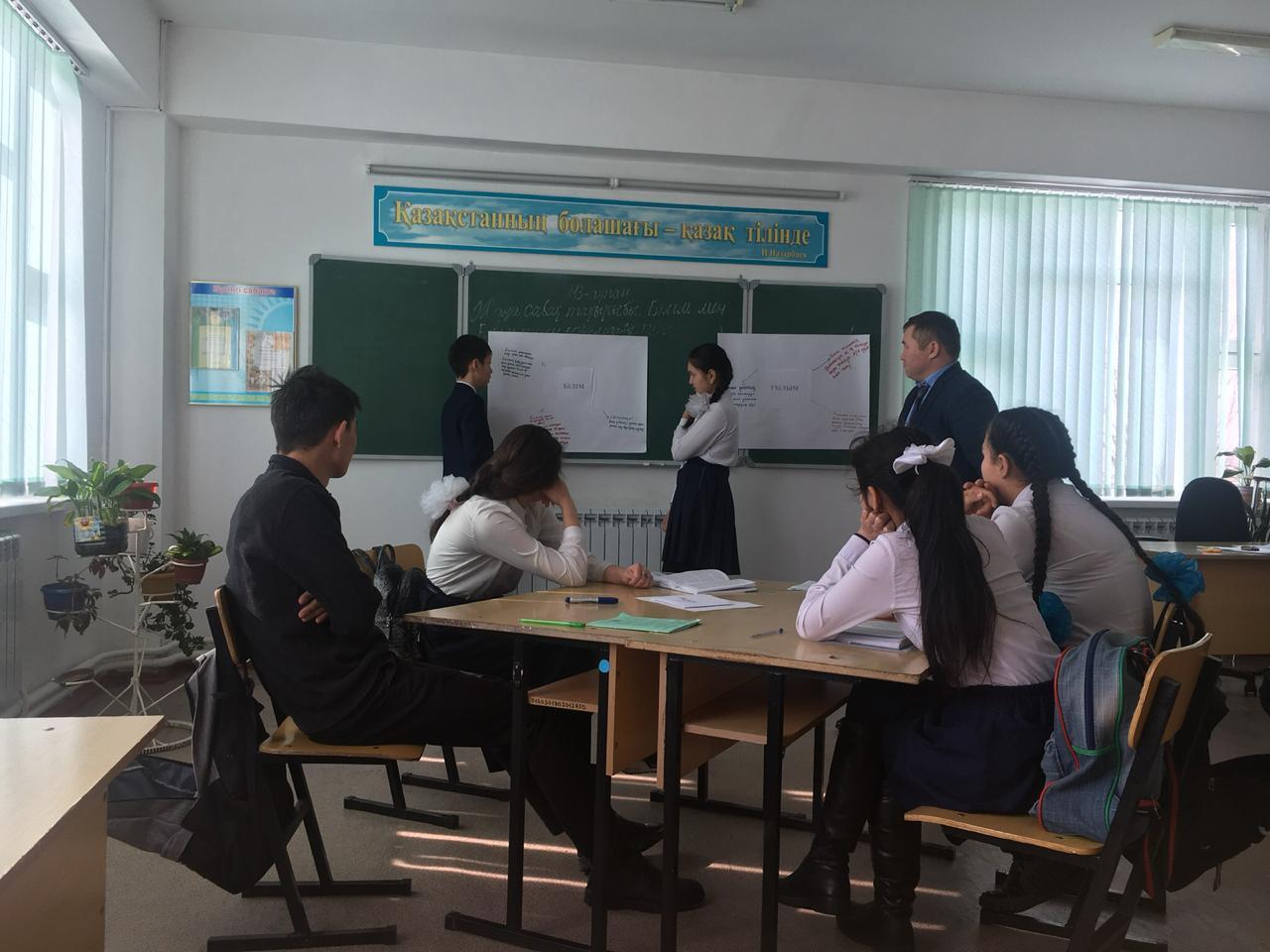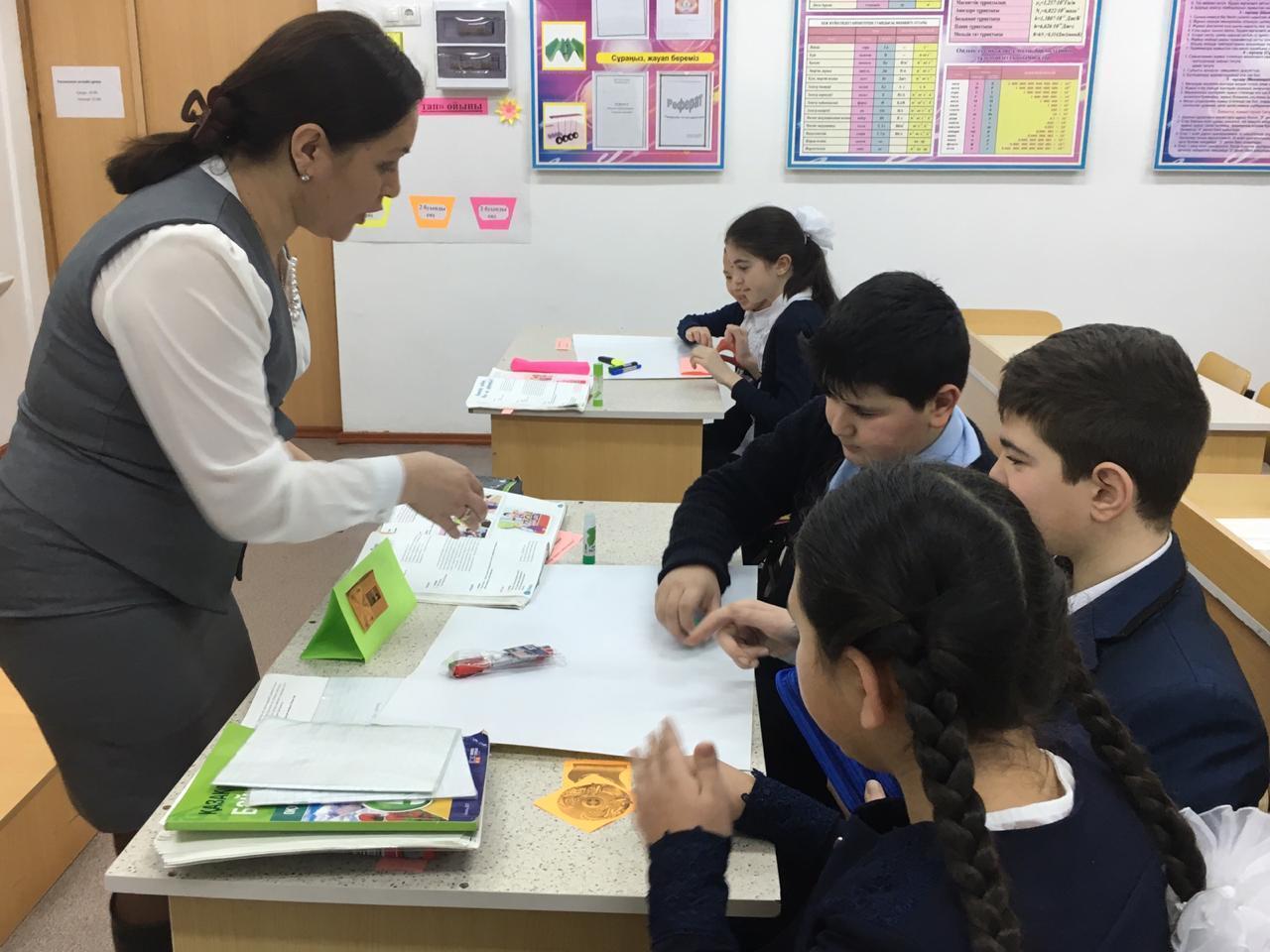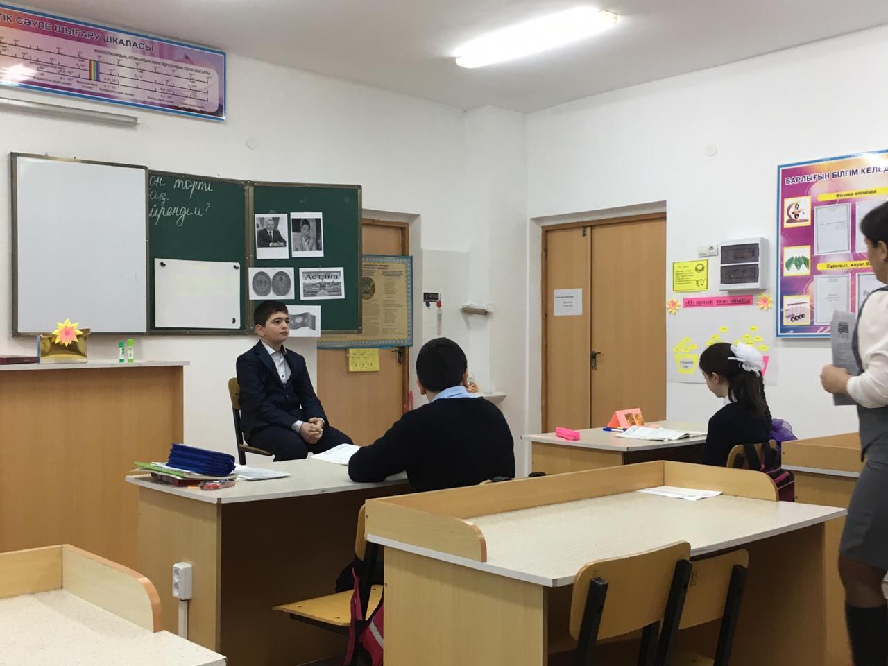 1.Н. Рахмитуллаева 5б орыс сыныбында қазақ тілі мен әдебиеті пәнінен «Нәтиже сабақ. Мен не үйрендім?» тақырыбында ашық сабақ көрсетті. Мұғалім сабақты жаңартылған бағдарлама бойынша өтті. Сыныпта 6 оқушы, Соловьев Владимир ауырып қалу себебімен сабаққа қатыспады. Мұғалім сабақта тақырыпқа байланысты көрнекілік құралдар мен дидактикалық материалдарды тиімді пайдалана білді. Сабақта «Шаттық шеңбер» стратегиясы арқылы психологиялық ахуал қалыптастырды. Мемлеккеттік рәміздер мен ұлттық валюта суреттер арқылы топқа бөлді. Сабақты «Миға шабуыл», «Суреттер сөйлейді», «Ыстық орындық» әдістерін тиімді пайдалана білді. Қазақ тілінде төл дыбыстарды еркін айтады. Аталған әдістер арқылы жеке, жұпта, топта тапсырмалар орындалды. Әр тапсырмадан соң қалыптастырушы бағалау үдерісі жүріп отырды. Оқушылар сабаққа белсене қатысты.